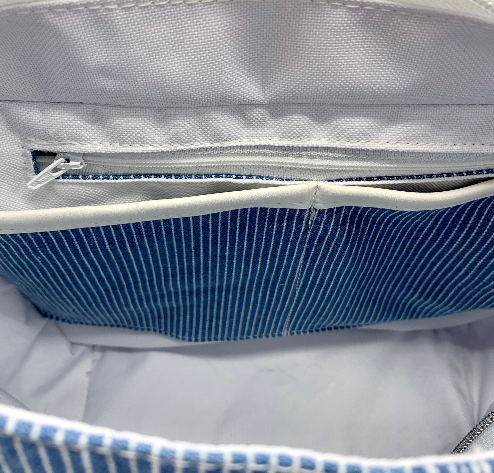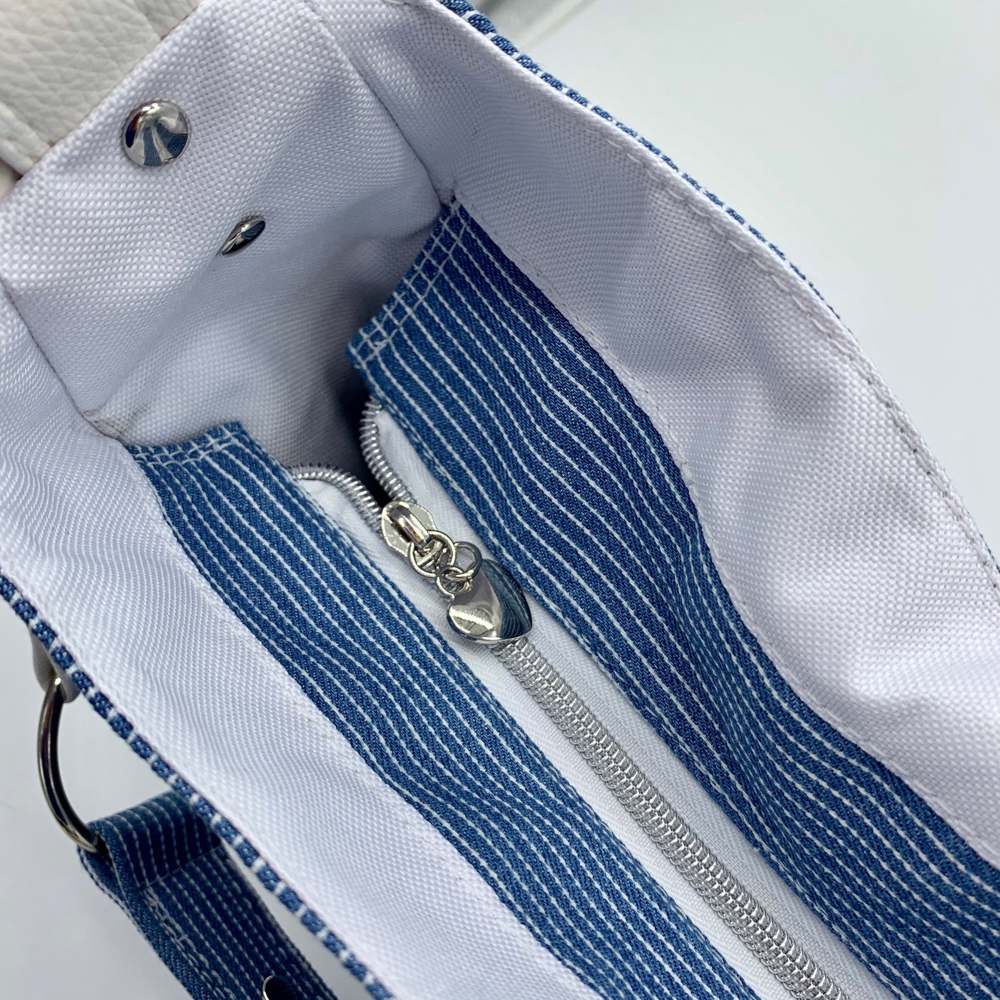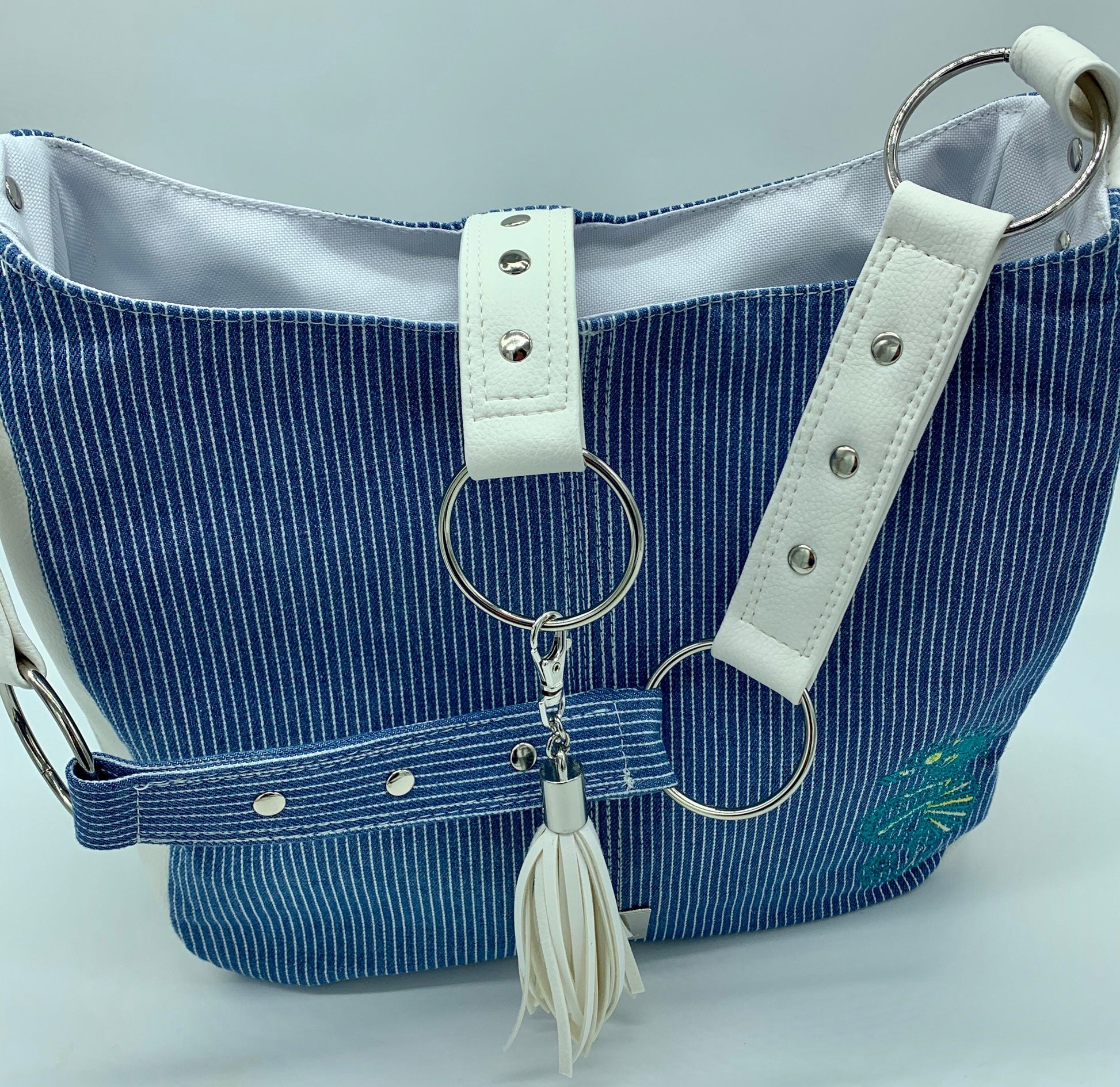 This is a stylish custom embroidered with a seahorse handbag. She is a gorgeous high quality white faux leather/ striped denim and accented with nickel hardware. She has pockets on both exterior sides. Great to hold your keys and phone. Inside have a white waterproof canvas, featuring one large zip pocket and a slip on the other side. She has a zip closure to keep in all your essentials.