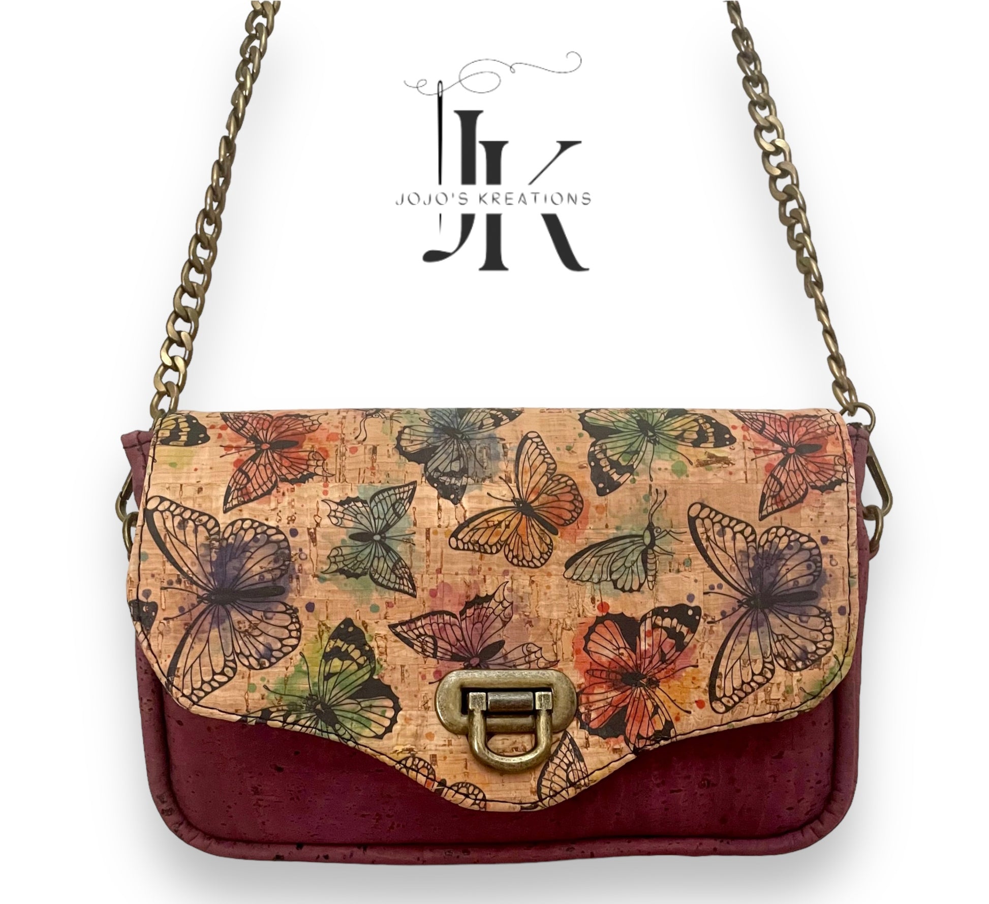 this beautiful clutch is the Esmeralda handbag. The exterior is made with cork featuring beautiful butterflies. It has 2 magnetic snap closures and a flip lock. The interior is all cotton and features, three card slots and a zipper pocket. The back of the exterior has a large pocket to hold your cell phone, keys and all your small essentials. It features a removable 48" chain. you can use it as clutch, shoulder, or a crossbody.