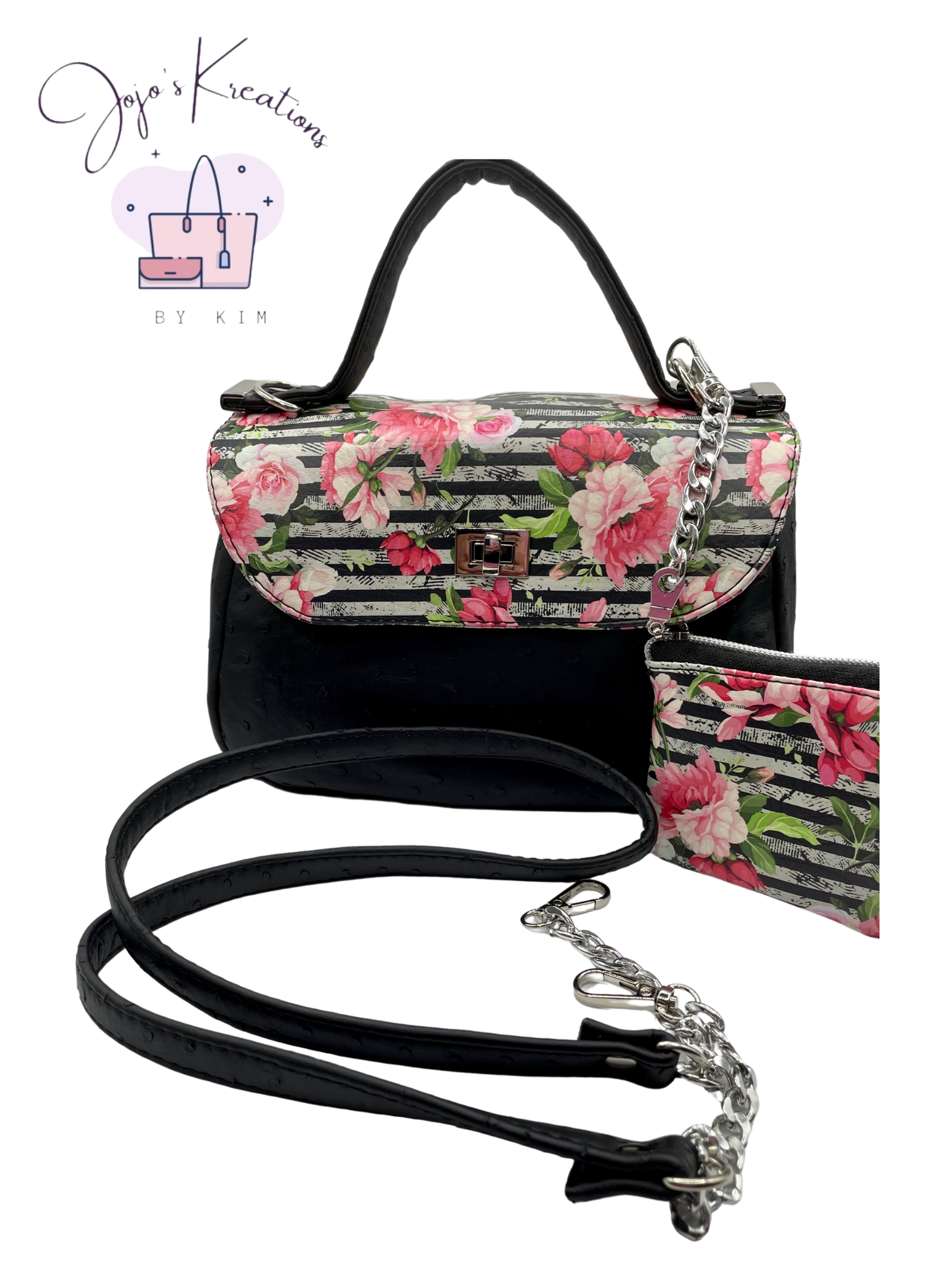 She is made with a beautiful black ostrich faux leather for the front and back and a black and white stripes with beautiful pink roses for the flap. It also comes with a matching pouch, with a silver chain and key ring, to carry your keys, change, etc. She features a silver turn lock and a optional shoulder strap.