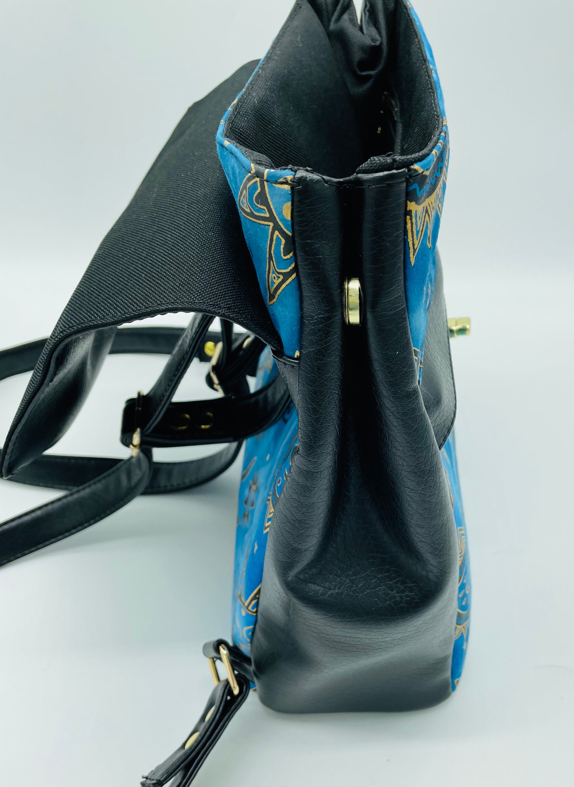 The exterior is made out of a high quality black faux leather, and blue Celestial material with gold accents. The hardware is gold plated, with a functional turn lock. It has a larger front hidden zipper pocket.