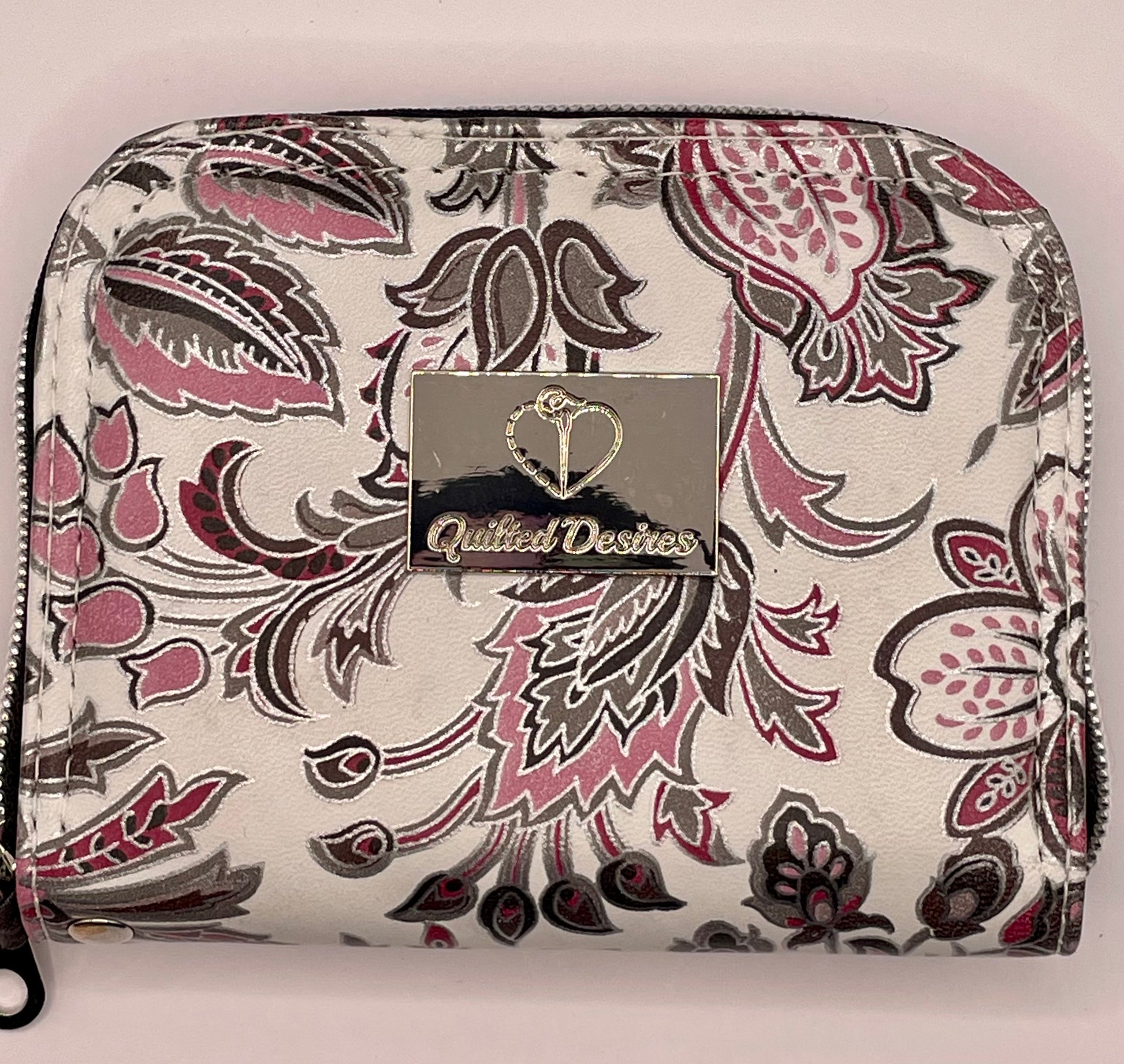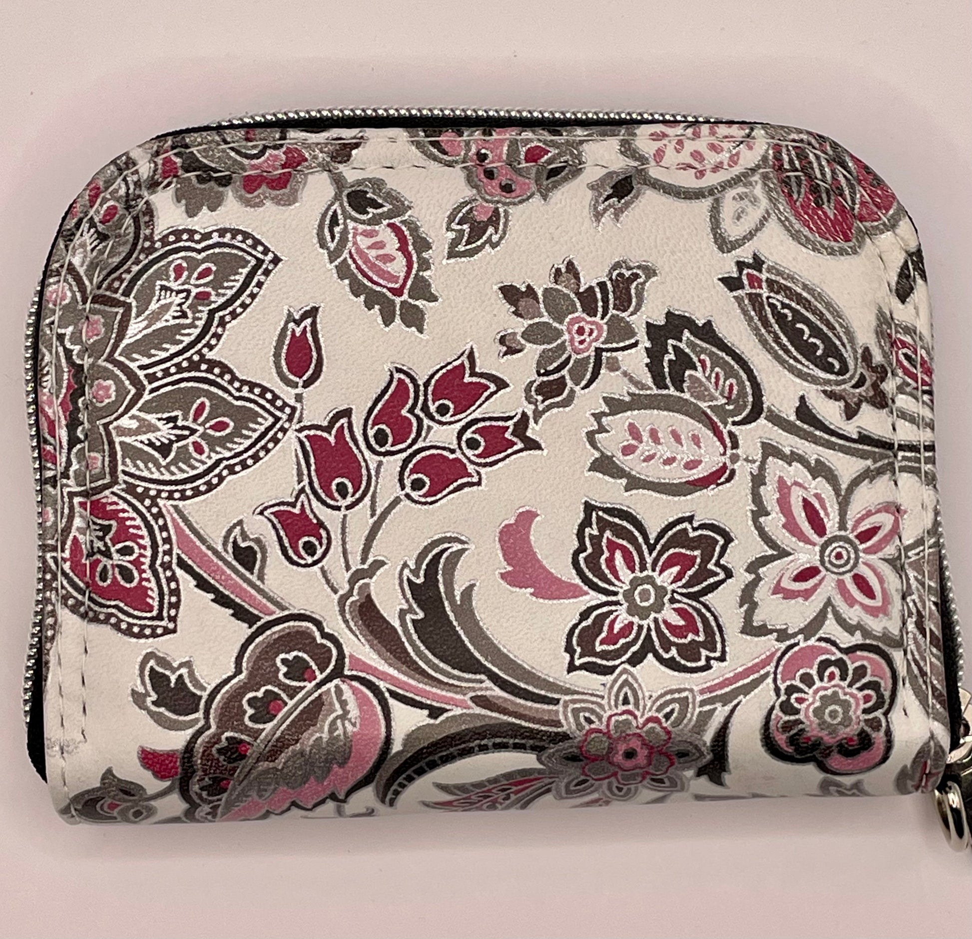 This wallet features 4 credit card slot pockets, 2 bill pockets, 2 open pocket areas for receipts as well as a full depth center zippered pouch.