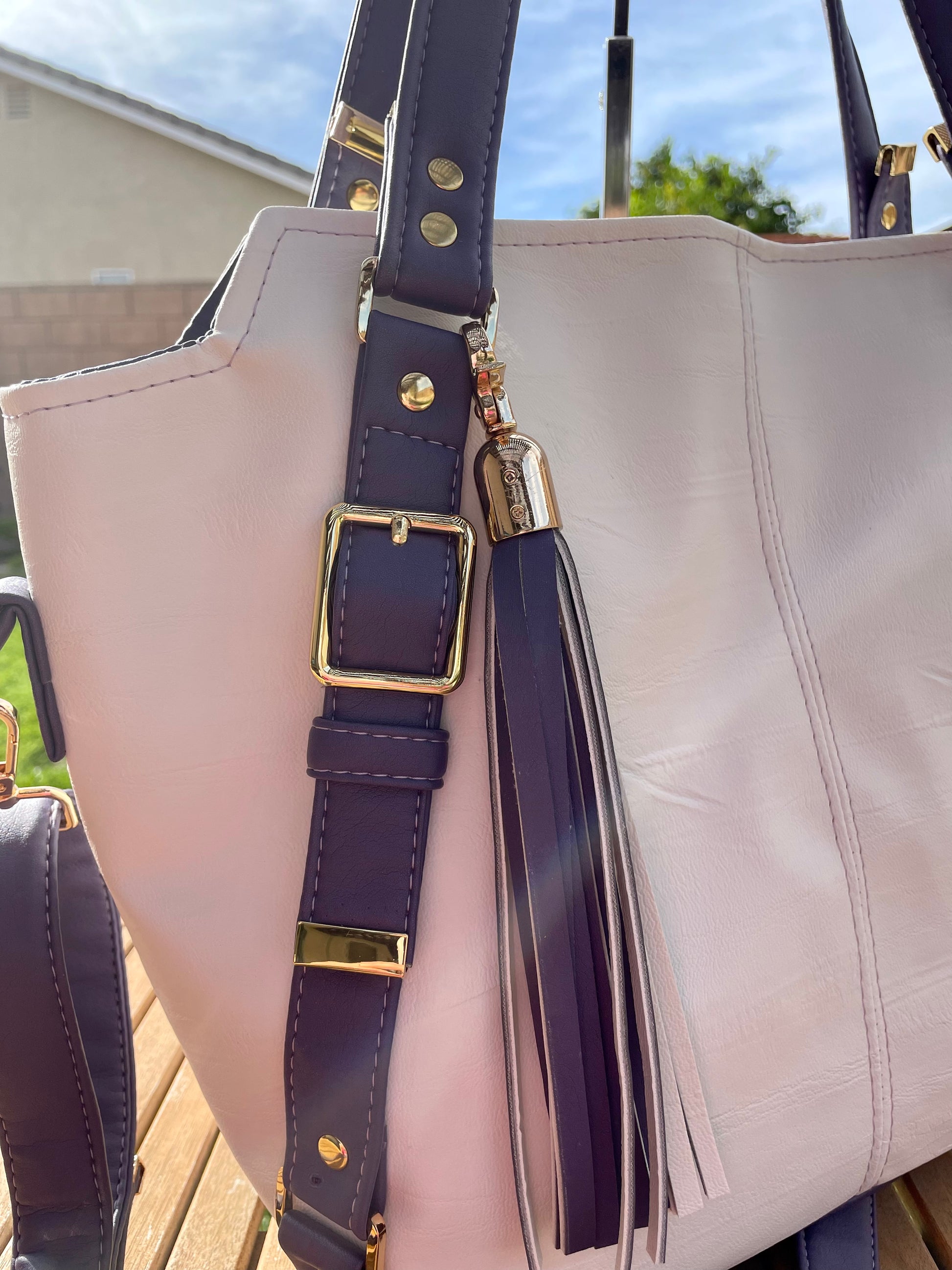 This bag is made with White textured faux leather with a beautiful contrasting purple. It is semi-structured with a delicate slouch. The front and back decorative straps lend the bag a high end look. The detachable adjustable strap allows the bag to be worn as a crossbody bag. The handles are long enough for the bag to be worn on the shoulder.