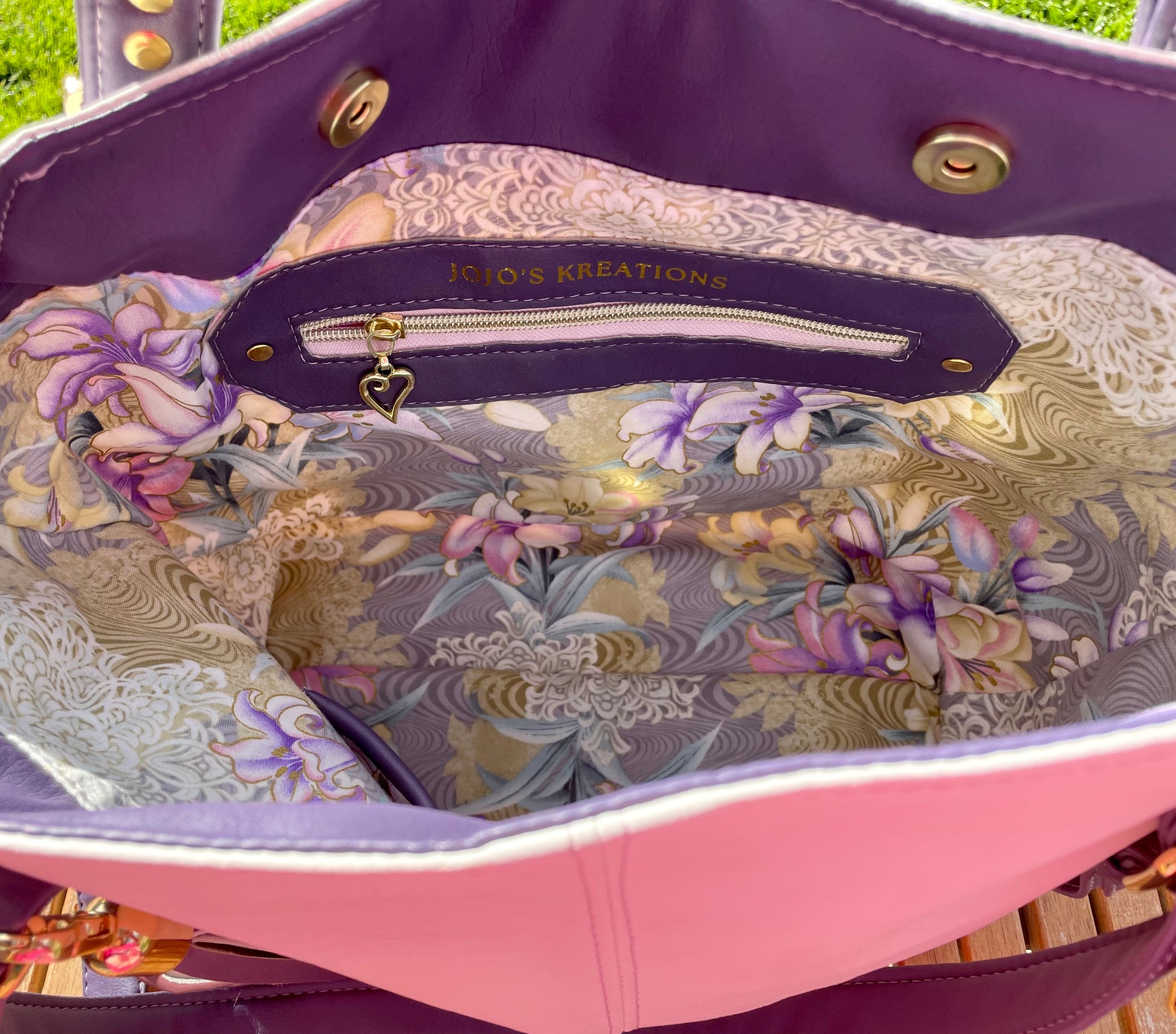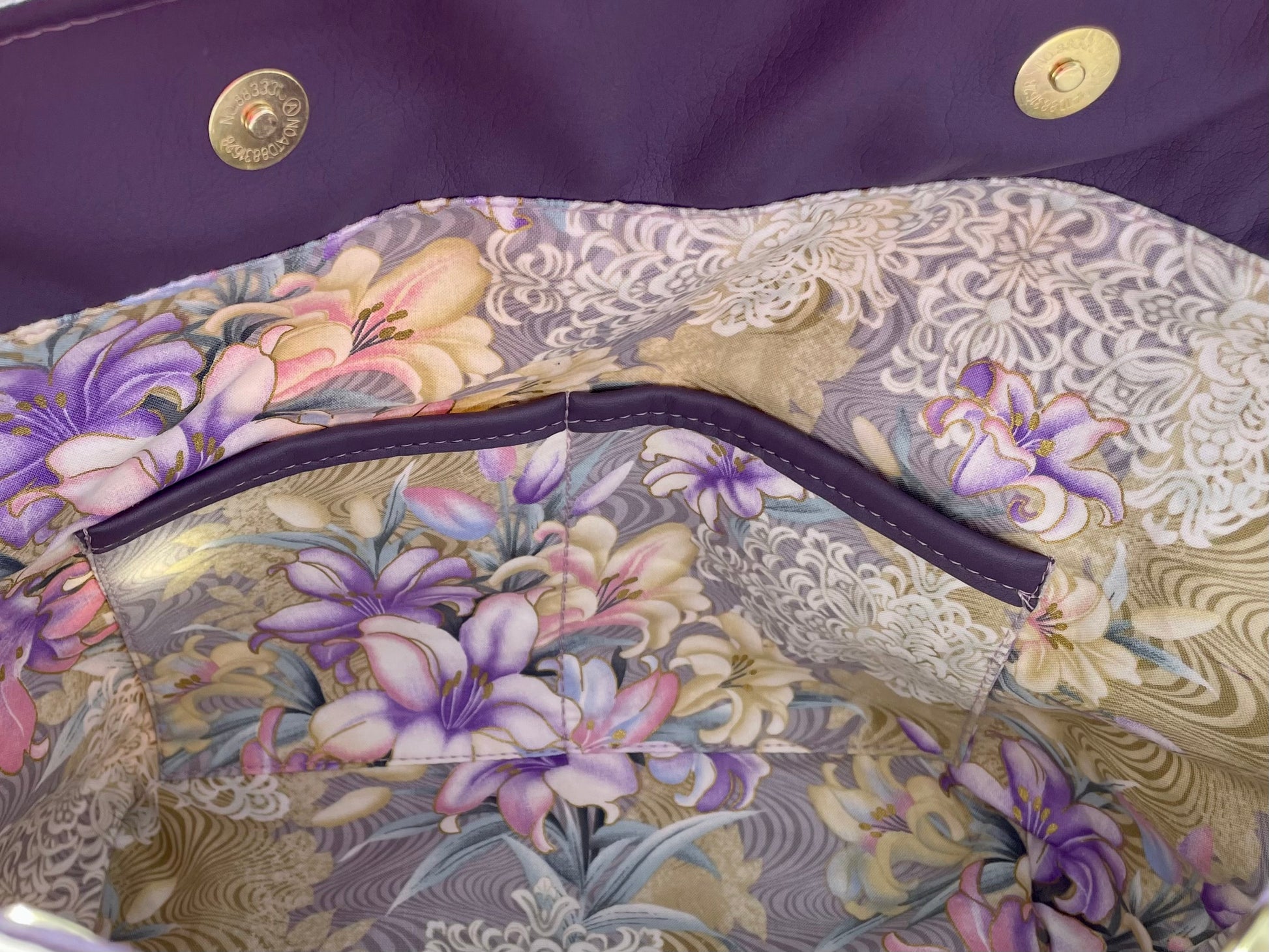 The interior is a beautiful Purples, whites, cream and gold floral cotton. It features a zippered pocket and a slip pocket, with two magnetic snap closure.